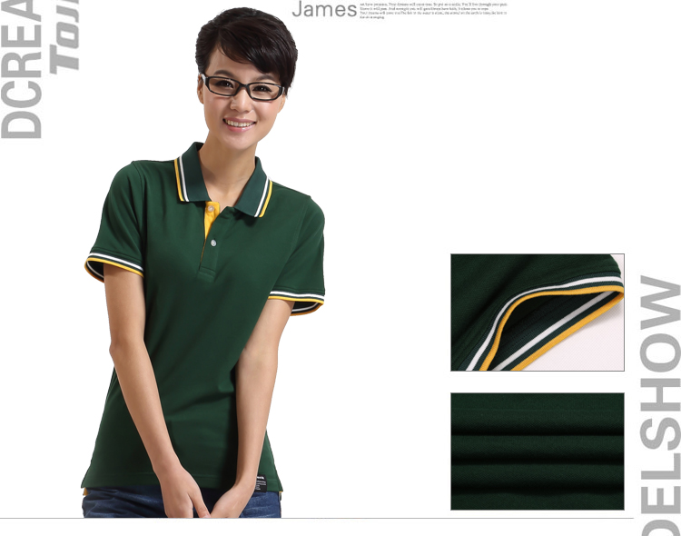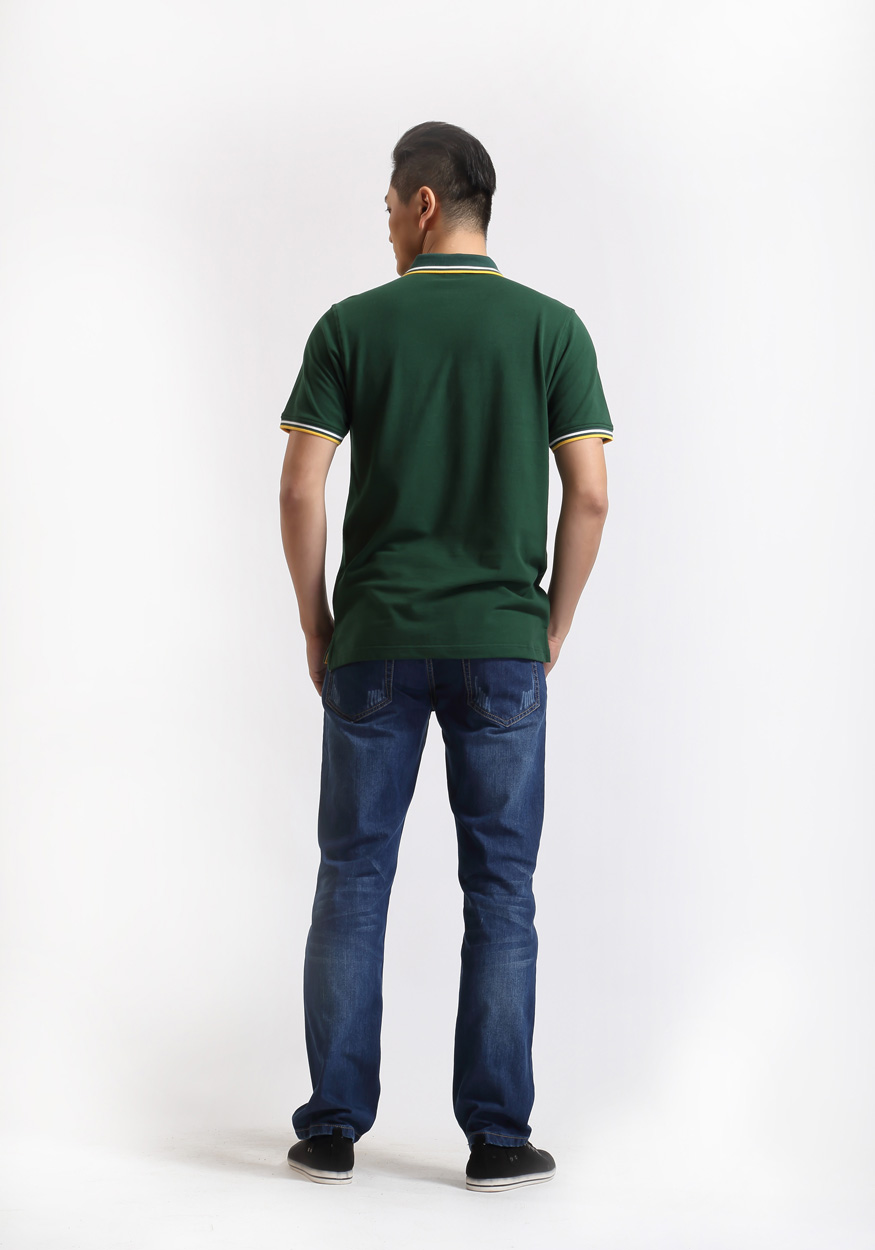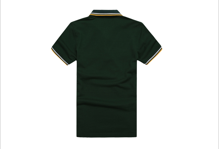 墨綠色珠地棉POLO衫款式,領(lǐng)袖間條撞色,男女時(shí)尚款定制