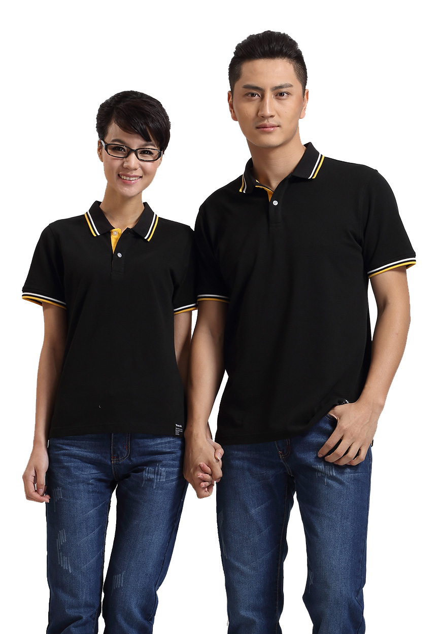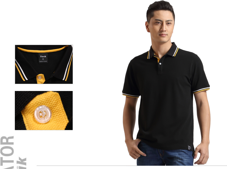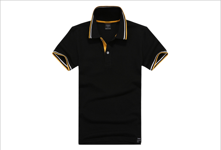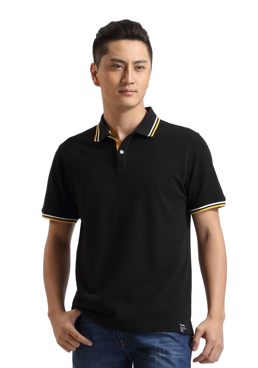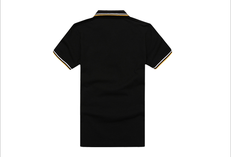 > 黑色珠地純棉t恤衫,領(lǐng)袖間條撞色,門襟撞色款式制作