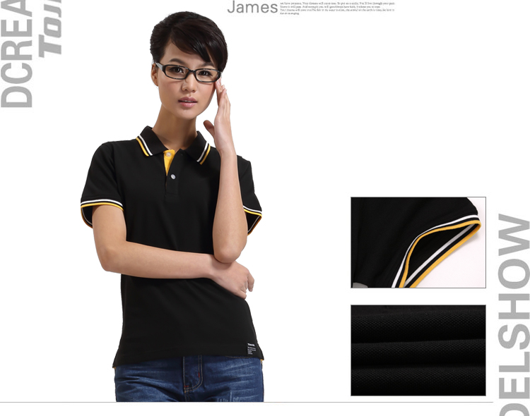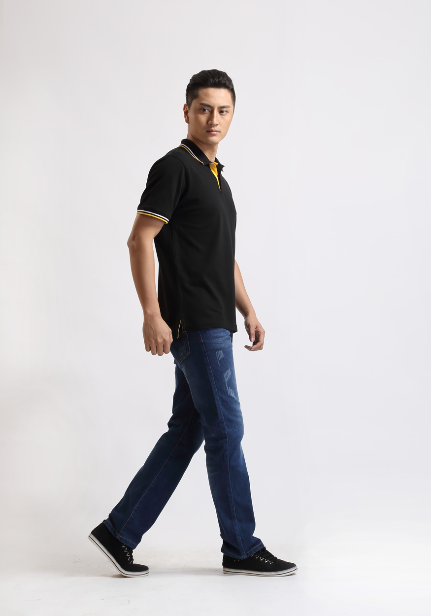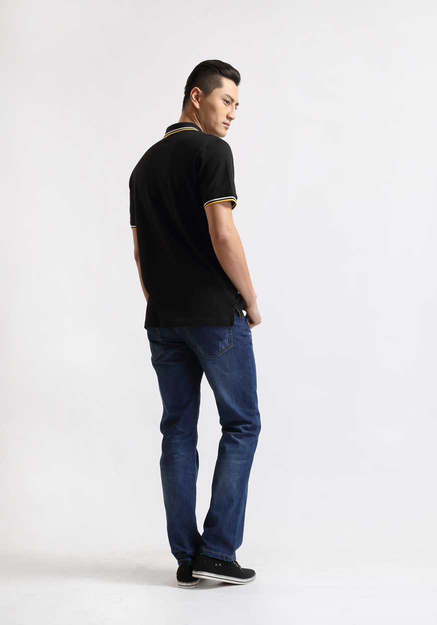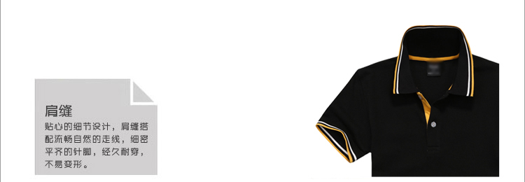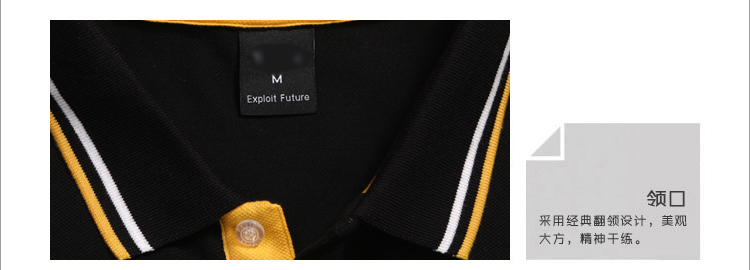 > 黑色珠地純棉t恤衫,領(lǐng)袖間條撞色,門襟撞色款式制作